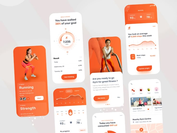 - Interactive elements like swipeable workout cards and animated progress trackers.