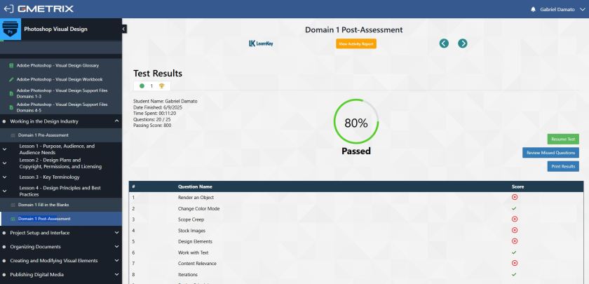 Here I have a screenshot of my Photoshop Domain 1 Post-Assessment. This is what you will need to send in for a grade when you are assigned a LearnKey domain. The screenshot needs to include your name on the top right (to prove it really is you) and have the score visible (mine was an 80% because I rushed it, you should do better).
