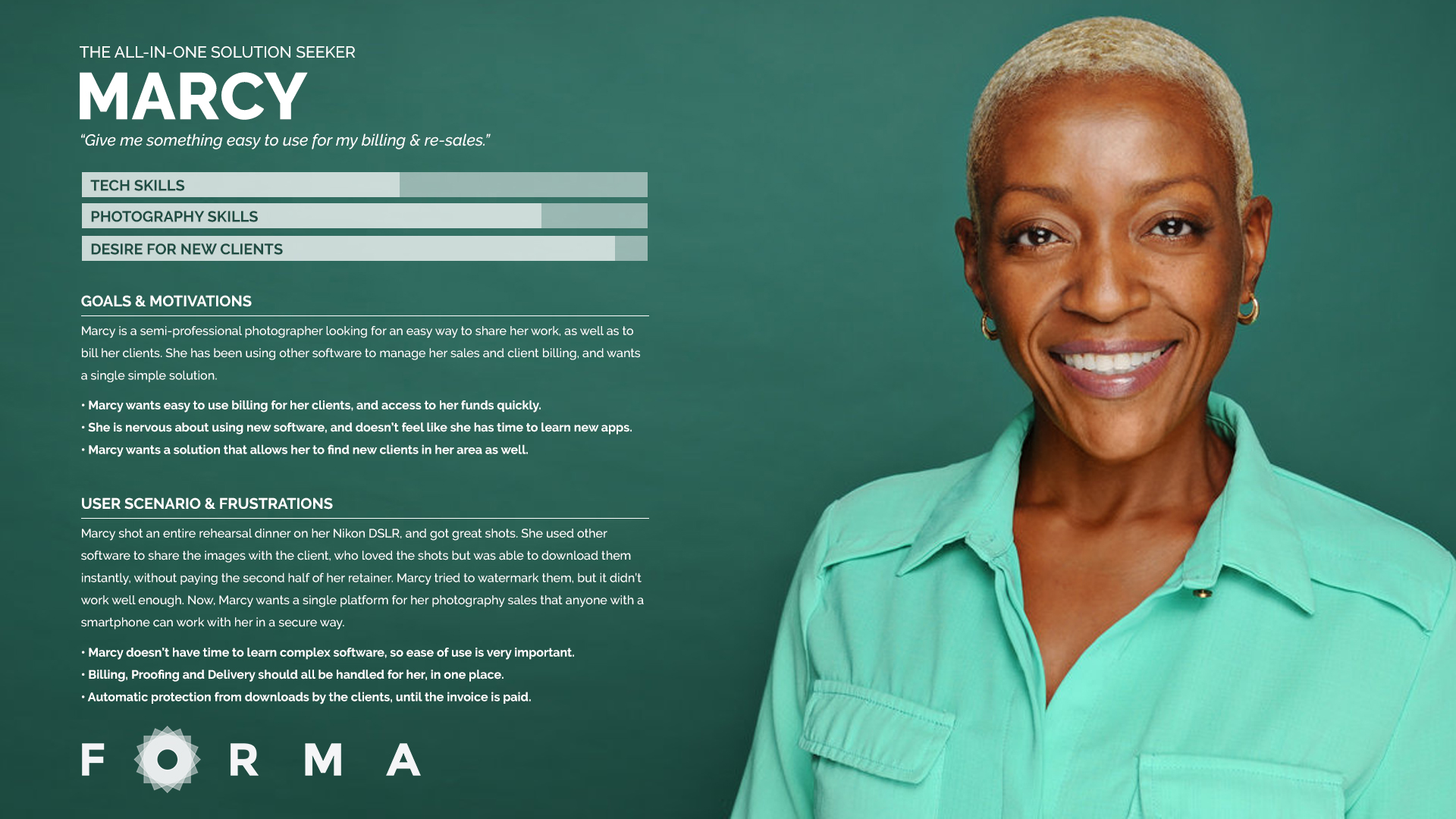 Here you can see I designed just one User Persona for the Forma App, as an example to you. Notice that all the basic information has been added to the design, but the design itself also fits into my branding endeavors for the Forma App.