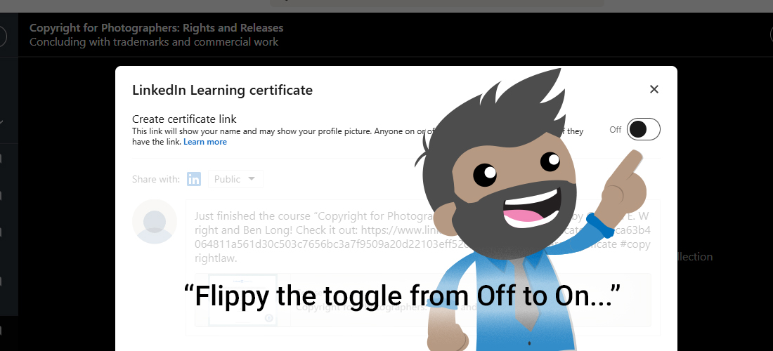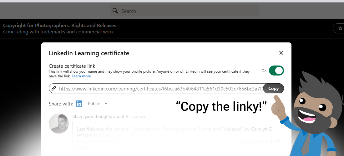 Step 2: Create your Certificate Link by toggling the OFF over to ON. This link will now be publicly available so that you can copy/paste it to turn it in via email.